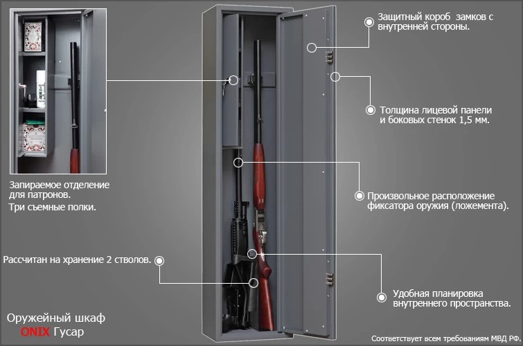 Шкаф Onix Гусар по всем параметрам соответствует требованиям МВД к содержанию огнестрельного оружия. Однако следует учитывать, что уровень взломостойкости такого шкафа невелик, и его следует размещать в хорошо охраняемом помещении. Для повышения надёжности и устойчивости весьма желательно прикрепить шкаф к стене или полу, используя имеющиеся анкерные отверстия.